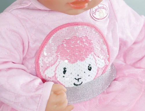 “Der kuschelige Strampler mit angenähten Füßchen ist so weich wie Wolken-Wolle. Im Brustbereich bilden glitzernde Pailletten Baby Annabells Lieblingsschäfchen ab. Darüber gehört der Stufenrock mit silbernem Saum.