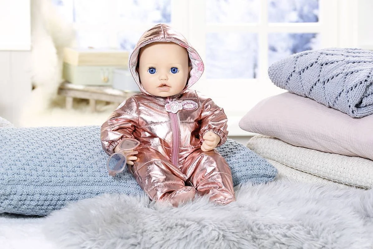 Baby Annabell sitzt mit offenem Mund auf ihrem Schlitten und staunt, wenn die Schneeflocken vom Himmel fallen. Das bitzelt so schön lustig, wenn ein Eiskristall auf die Wange oder die Zunge fällt. Damit die kleine Eisprinzessin nicht friert, bekommt sie ihren Schneeanzug angezogen. Reingeschlüpft, Reisverschluss mit Schäfchen-Anhänger hochgezogen, fertig. Der Overall im top aktuellen Metallic-Look hat angenähte Füßchen und eine Kapuze. Jetzt nur noch die Sonnenbrille aufsetzten, dass der Schnee nicht blendet und schon kann Baby Annabell mit Mama und Papa den Schlittenhügel hinunter düsen.