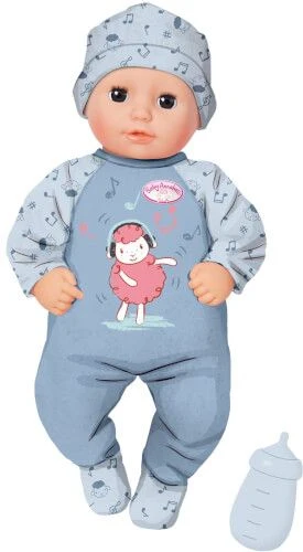 “„Wenn ich groß bin, will ich Musiker werden! scheint das blaue Outfit des 36cm großen Alexanders zu sagen. Das aufgedruckte Schaf tanzt mit Kopfhörer auf der Wolke zwischen Noten. Auch die Füßchen, die Ärmel und die Mütze sind mit süßen Noten-Grafiken bedruckt.