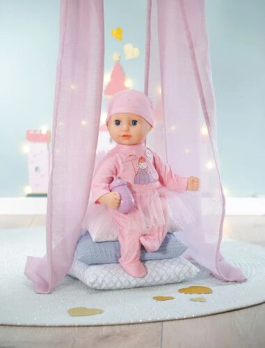 Die süße Kleine träumt davon eines Tages eine Prinzessin zu sein. Deshalb sieht ihr Strampler auch aus, wie eine königliche Robe. Da darf ein Tüll-Röckchen nicht fehlen und Baby Annabells Lieblingsschaf ist als Königin verkleidet aufgedruckt. Der Strampler ist im easy fit Style gefertigt und lässt sich selbst von kleinsten Kinderhänden einfach an- und ausziehen. Ein herziges Mützchen schützt den Kopf der Träumerin. Wenn man die 30 cm große Puppe auf den Rücken legt, schließt sie ihre Schlafaugen. Ihr Körper ist weich gestopft und lädt zu verspielten Kuschelstunden ein. Zusätzlich bringt sie ein Fläschchen für erstes (Rollen-)Spiel mit. Baby Annabell Markenspielpuppe Die kleine Einsteigerversion“ (36 cm) mit weichem Puppenkörper. Im easy fit Style. Mit Schlafaugen. Animiert Kinder ab einem Jahr behutsam zum (Rollen-)Spiel und setzt erste Anreize zur Entwicklung von Einfühlungsvermögen und Verantwortungsbewusstsein.