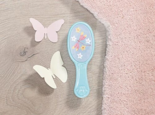 „Ohhh, ein Erdbeer-Vanille-Eis-Falter! Sophia liebt Schmetterlinge und gibt ihnen immer Namen, die ihren liebsten Eissorten ähneln. Die Exemplare auf ihrem Kleid und den Schuhen sind gelblich wie Vanilleeis und an den Flügelspitzen rosa wie Erdbeereis – also sind das dann Erdbeer-Vanille-Eis-Falter, ganz klar… Das Kleid besteht aus einem weißen Oberteil und einem blauen Rock. Darunter trägt Sophia rosa Leggings. Ihr qualitativ hochwertiges braunes Haar lässts sich schön mit ihrer blauen Bürste kämmen und kann immer wieder zu neuen Frisuren gestylt werden. Das blaue Haarband mit Rose kommt in ihrer dunklen Haarpracht besonders gut zur Geltung.