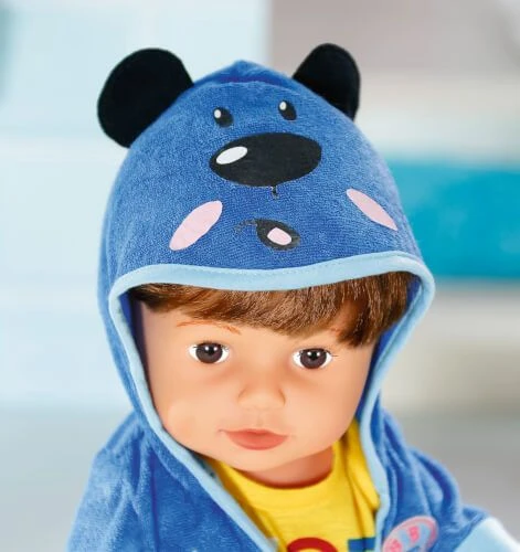Die Kapuze mit Bärengesicht und Öhrchen ist extrem cool. Eisbären können ja bekanntlich auch sehr gut schwimmen. Hochwertige Kleidung für die BABY born Markenspielpuppe. Für erweitertes, abwechslungsreiches und langanhaltendes Spielvergnügen. Kinderleichtes An- und Ausziehen. BABY born Bath Deluxe Bademantel 43cm Aus Bademantel, Shirt, Shorts und Schuhen.“