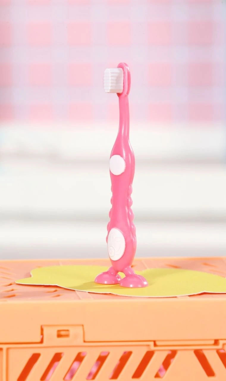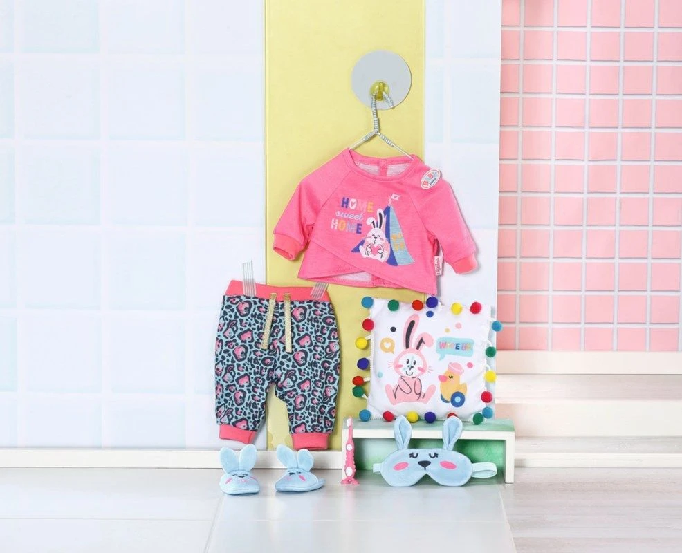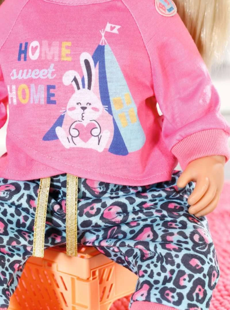 „Gääähhhhn! BABY born ist müde. Na, es ist ja auch schon spät. Noch schnell die Zähne mit der rosa Zahnbürste putzen und dann den Schlafanzug anziehen. Das kuschelige Langarmshirt hat einen raffiniert gearbeiteten Saum. Auf dem rosa Stoff ist Hase Benno aufgedruckt, der sich auch auf sein Nachtlager zu freuen scheint. Dazu trägt die kleine Träumerin eine türkise Hose mit aufwendigem Muster.