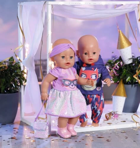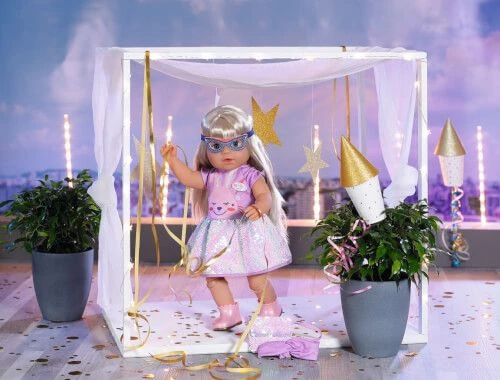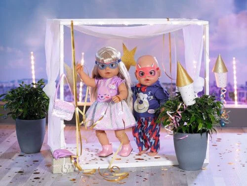 ‚ Wo habe ich denn wieder meine Brille hingelegt?“ Ja, mit 30 Jahren“ kann man sich diese Frage schon mal stellen. BABY born, die kleine Partyprinzessin feiert bereits ihr 30-jähriges Puppen-Jubiläum. Die blaue Maske kann sowohl als Brille am Kopfband getragen werden, als auch Hase Benno auf dem Kleid als Styling-Element dienen. Das Häschen ist schließlich gerne mit von der Party. Das Kleidchen hat einen Rock aus Wende-Pailletten. BABY borns Handtasche ist ebenfalls mit den glitzernden Scheibchen verziert. Um den Kopf trägt sie ein Stirnband im besonders trendigen Design. Rosa Booties runden das Geburtstagsoutfit ab. Hochwertige Kleidung für die BABY born Markenspielpuppe. Für erweitertes, abwechslungsreiches und langanhaltendes Spielvergnügen. Kinderleichtes An- und Ausziehen.