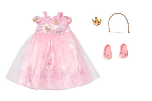 Mit diesem Set ist BABY born eine wahre Prinzessin mit luxúriösem Kleid, Krönchen, Handschuhen und goldenen Schuhen.
