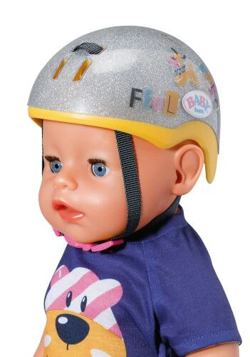 ‚Hui, da ist gerade ein kleiner Silberpfeil vorbei geflitzt. Das war BABY born mit ihrem stylischen Fahrradhelm. Die silberne Kopfbedeckung für mehr Sicherheit auf Tour schimmert im Sonnenlicht. Schön den Kinnriemen schließen, damit der Helm auch gut hält und schon kann s los gehen. Der Brother und die Sister stetzen das trendige Teil auch immer zum Skaten auf. Hochwertiges Zubehör für die BABY born Markenspielpuppe. Für erweitertes, abwechslungsreiches und langanhaltendes Spielvergnügen. Auch für kleinere Puppen geeignet. BABY born Fahrradhelm 43cm“