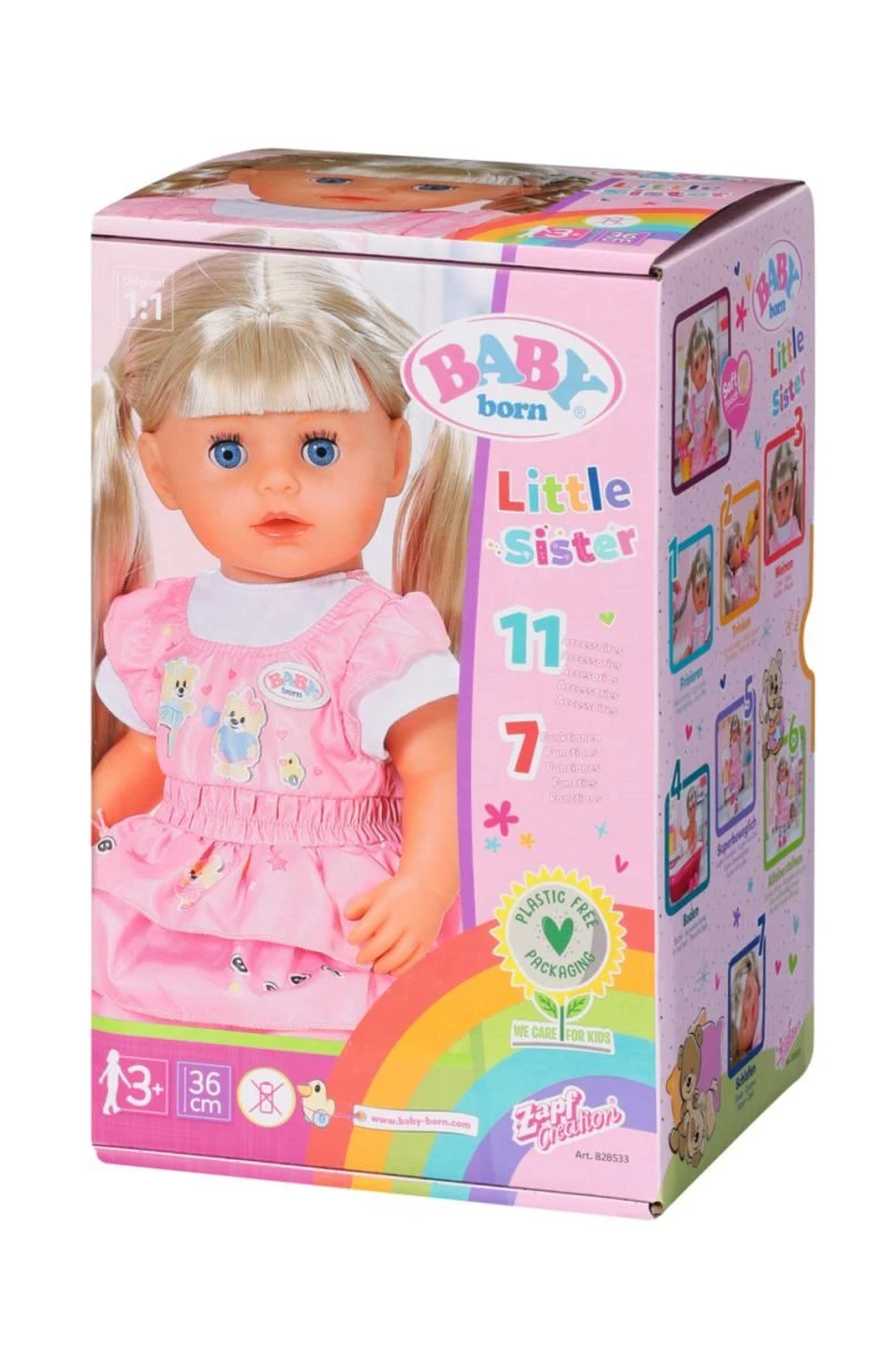 Die BABY born Familie bekommt Zuwachs. Die große Schwester der Little BABY born darf in den Kindergarten gehen. BABY born Kindergarten Little Sister mit Ihrem langen blonden Haar zum kämmen und frisieren, freut sich sehr darauf mit all Ihren Freunden im Kindergarten zu spielen. Inkl. 7 Funktionen und 8 Accessoires.