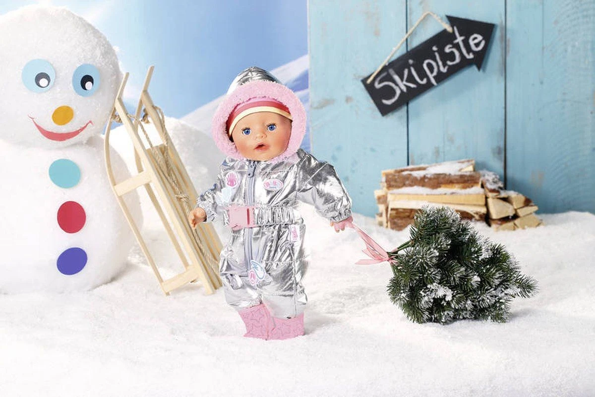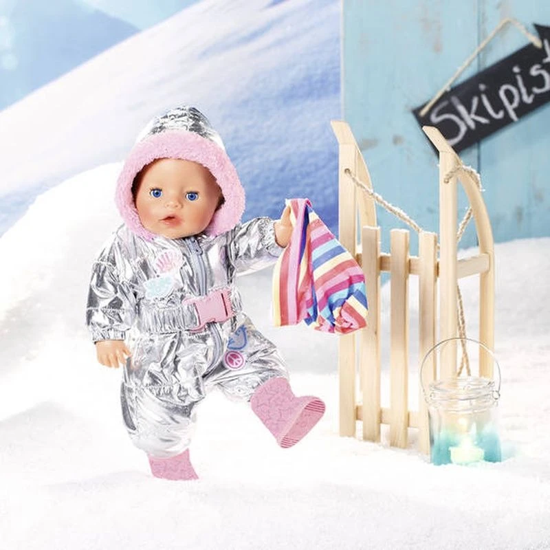„Aus der Bahn!“ BABY born saust mit dem Brother den Schlittenhügel hinunter wie ein kleiner Silberpfeil. Der Overall im trendigen Silber glitzert und funkelt in der Sonne wie Schneekristalle. Dank des rosa Plüsches an der Kapuze bleibt der Hals schön kuschelig warm, wenn BABY born die bunt gestreifte Mütze auf dem Kopf trägt. Damit die kleine Rennrodlerin keine kalten Füße bekommt, gibt es passend zum Schneeanzug rosa Stiefel mit Sternendruck.