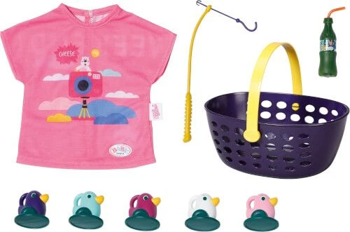 „Fischers Fritze fischt frische Fische… Ach, nein, BABY born angelt putzige Entlein. Während sie bequem im rosa Liegestuhl mit buntem Muster sitzt, versucht sie mit dem Haken der Angel eine der fünf Enten einzufangen. Hin und wieder nippt sie an der Limonade, die auf dem gelben Tischchen am Liegestuhl steht. Wenn alle Entlein geangelt sind und sich im blauen Körbchen tummeln, dürfe sie wieder in den Teich und das Spiel geht von vorne los. Zu diesem lustigen Angelspiel trägt BABY born ein lässiges rosa Longshirt mit coolem Druck.