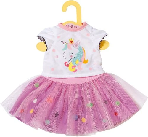 Mit Dolly Moda kann man immer punkten. Dank des lässigen Schnitts können BABY born, Baby Annabell und andere Puppen in einer Größe von 39-46 cm fröhlich die Kleidung hin und her tauschen. Vom weißen Shirt mit verspielten Ärmelabschlüssen schaut ein verträumtes Einhorn herunter. Vielleicht tanzt es im Schlaf durch bunte Punkte, die vom magischen Himmel fallen? Denn sowohl das Shirt als auch das Tutu sind mit farbenfrohen Punkten versehen. ,,Original Zapf Creation Kleidung für die Markenspielpuppen BABY born, Baby Annabell und andere Puppen in einer Größe von 39-46 cm. ,,Für Puppen in einer Größe von 39-46 cm. ,,Erweitert die Spielmöglichkeiten, regt die Fantasie an und fördert kreatives Rollenspiel. Dolly Moda Einhorn Shirt mit Tutu 43cm