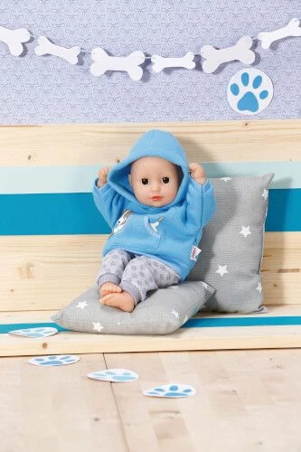 Blauer Hoodie mit Taschen und Hundedruck zusammen mit einer grauen Jogginghose mit Pfötchenabdrücken. Geeignet für Puppen in der Größe 34 bis 38 cm.