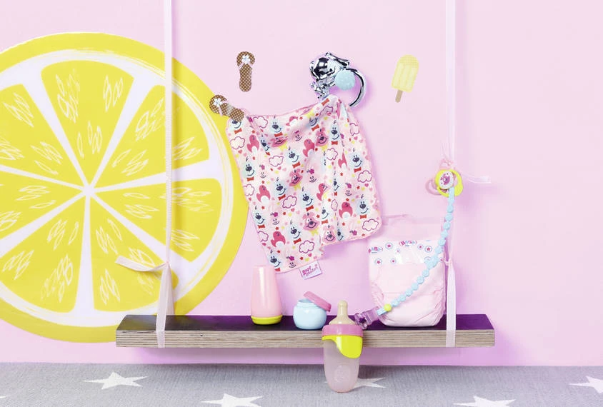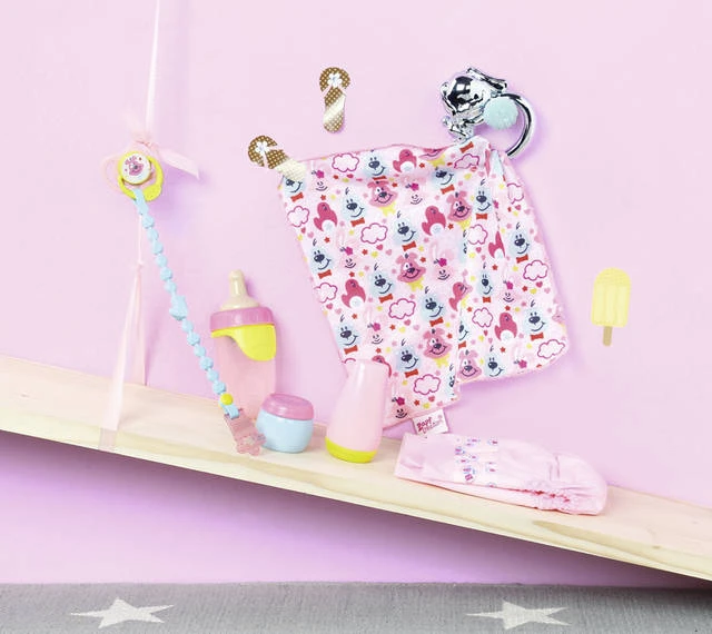 BABY born® Accessoires-Set aus Fläschchen, Windel, Puderdose, Cremetube, Schmusetuch mit Rasselring und Schnuller mit Schnullerkette.