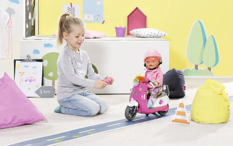 Bahn frei für BABY born®s ferngesteuerten Scooter. Das Gefährt in rosa kann nicht nur vorwärts, sondern auch rückwärts durchs Kinderzimmer fahren. BABY born® kann dabei ganz bequem auf dem breiten Sitz Platz nehmen und ihre Hände am Lenker einhängen. Beim Abbiegen leuchten die Blinker links oder rechts, damit Plüschtiere und Puppenfreunde den Weg frei machen können.BABY born®s Ausflüge sind alles andere als langweilig, deshalb muss der Scooter auch cool designed werden. Mit den Buchstabenaufklebern wird das nächste Reiseziel angeschrieben und entsprechen mit Symbolen wie Ente für Entenhausen, Lucky für Glücksstadt oder Hufeisen für Pferdsfeld beklebt.