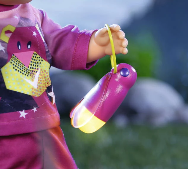BABY born ist ein kleiner Nachtschwärmer. Wenn sie nicht schlafen kann, klettert sie ganz frech aus ihrem Bettchen und macht sich mit ihrer Glühwürmchen-Taschenlampe auf den Weg, um sich zu Mama und Papa ins Bett zu kuscheln. Drückt man das erste Mal auf die Flügel des Falters beginnt er zu blinken, beim zweiten Klick leuchtet er durchgängig und ein dritter Druck macht das Licht wieder aus. Dank der langen Hose und des Longsleeves ihrer Schlafanzüge in blau oder pink muss BABY born auf ihren nächtlichen Touren auch nicht frieren.