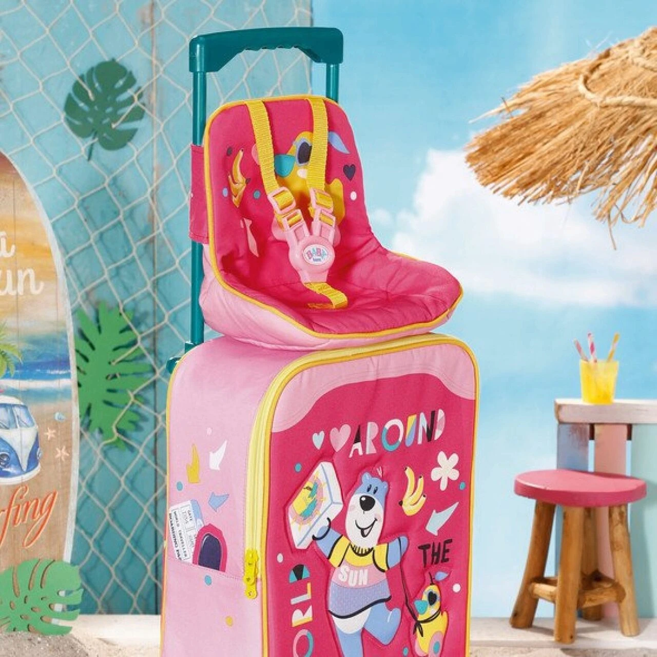 Wenn die ganze Familie auf Reisen geht, muss natürlich auch BABY born dabei sein. Sie darf aber nicht einfach im Koffer verschwinden, sie soll schließlich auch etwas von der Reise mitbekommen. Mit dem süßen Trolley geht’s deshalb um die Welt, around the world. In das Gepäckstück mit extra Aufbewahrungsnetz im Inneren passen allerhand Puppen- und Kinderkleider, sowie BABY borns Windeln und ihr Fläschchen. Die kleine Weltentdeckerin kann dann bequem oben auf dem Trolley im Reisesitz Platz nehmen. Der Sitz wird am höhenverstellbaren Henkel des Rollkoffers befestigt und BABY born darin gut mit dem Gurtsystem angeschnallt. So ist sie immer mit dabei und kann alles gut beobachten.
