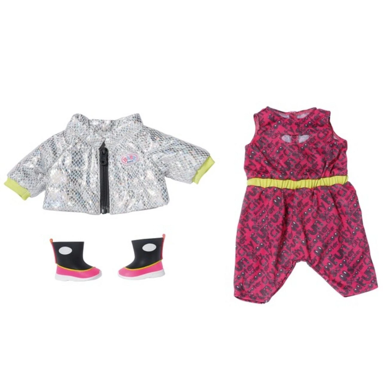 Der pinke Onesie mit stylischen Letterdruck ist herrlich bequem. Da verrutscht nichts, egal ob BABY born auf dem Roller durch die Gegend braust oder kopfüber vom Klettergerüst hängt. Als besonderes Design-Element ist am Dekolleté ein Loch eingearbeitet. Die Bündchen der silbernen Glitzer-Jacke greifen das Gelb des elastischen Gürtelbandes auf. Passend dazu trägt die kleine City-Rockerin coole Boots.