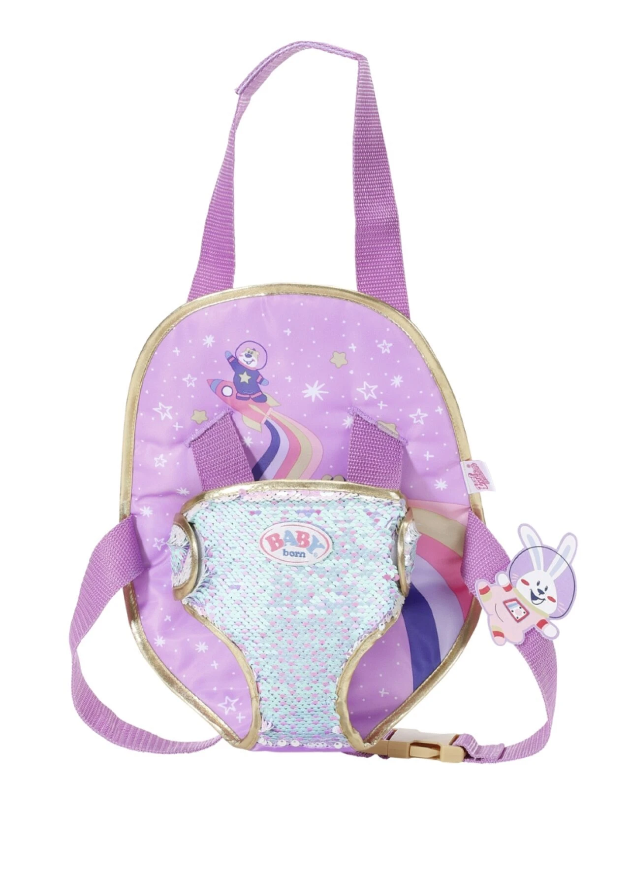 Der Tragesitz für kleine Weltraum-Prinzessinnen hat ein verstellbares Gurtsystem für verschiedene Kindergrößen.