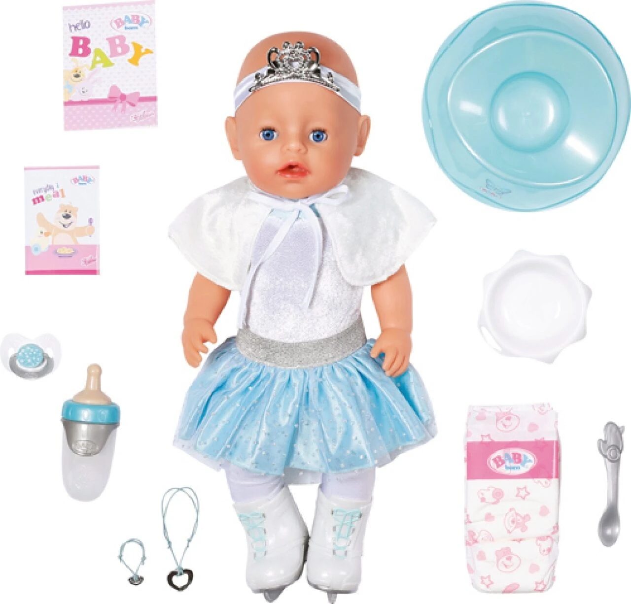 ‚Huiiii gleiten, gleiten, gleiten und jetzt eine Drehung!“ BABY born ist auf dem Weg zur Eishalle im Autositz eingeschlafen und träumt vom Eiskunstlauf. Das passende Outfit hat sie schon an. Über dem Gymnastikanzug mit Tüll-Ärmelchen trägt sie ein eisblaues Tutu. Das Köpfchen schmückt ein Diadem. Und natürlich hat sie ihre Schlittschuhe dabei. Eislaufen, Schlafen, Baden und Essen sind des Girls Lieblingsbeschäftigungen. Sie trinkt gerne Wasser aus ihrem Fläschchen und kann dann Pipi in die Windel oder ins Töpfchen machen und echte Puppentränen weinen. Neben Wasser steht der BABY born Brei auf dem Speiseplan. Dann macht sie sogar ihr großes Geschäft. Ihre Arme, Beine und der Kopf sind super beweglich, so dass das An- und Ausziehen der Tanzkleidung zum Kinderspiel wird. Nach dem Eiskunstlauf-Training wird dann erst mal ausgiebig geschlummert. Legt man das Girl auf den Rücken, schließt es automatisch die Schlafaugen. 10 Accessoires, die ihre Funktionen unterstützen, gehören zur Erstausstattung. BABY born Soft Touch Mit 9 lebensechten Funktionen für große Spielfreude. Das abwechslungsreiche (Rollen-)Spiel mit BABY born fördert die Fantasie und unterstützt nachweislich die Entwicklung sozialer Fähigkeiten und Werte wie Verantwortung, Kommunikation und Einfühlungsvermögen. Benötigt keine Batterien. BABY born Soft Touch Girl Eisballerina 43cm mit Onesie, Rock, Umhang, Schlittschuhen und Diadem.