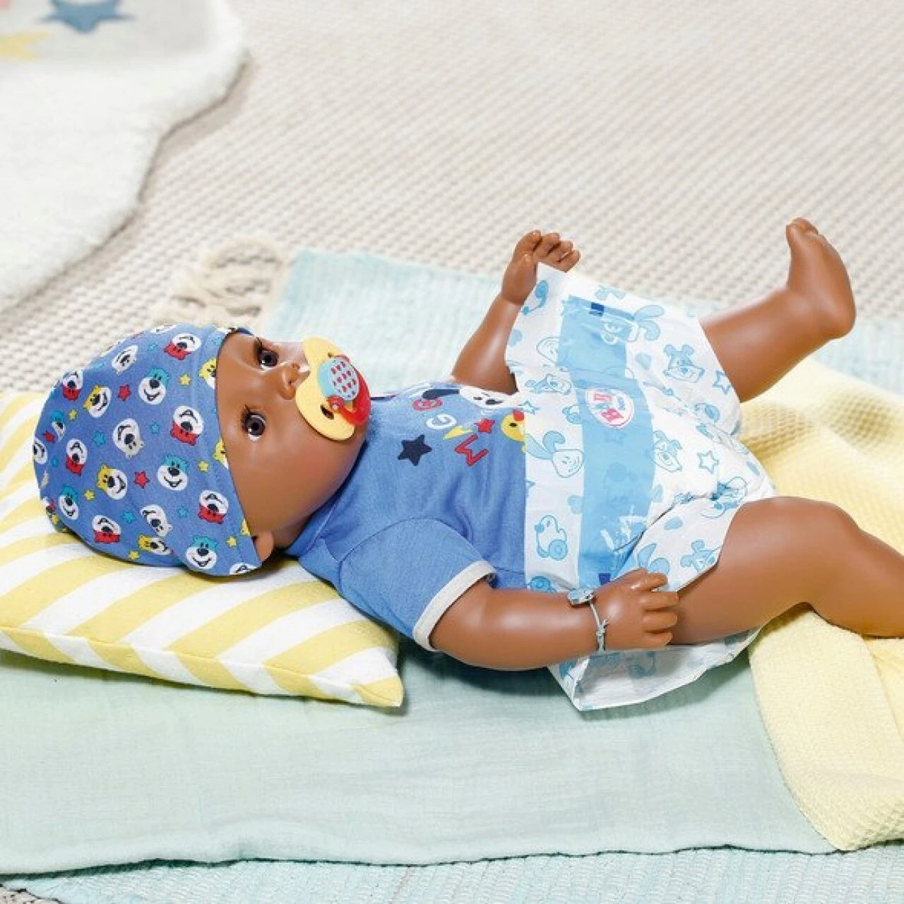Schlafen, Baden und Essen sind des Boys Lieblingsbeschäftigungen. Er trinkt gerne Wasser aus seinem Fläschchen und kann dann Pipi in die Windel oder ins Töpfchen machen und echte Puppentränen weinen. Neben Wasser steht der BABY born Brei auf dem Speiseplan. Dann macht er sogar sein großes Geschäft. Seine Arme, Beine und der Kopf sind super beweglich, so dass das An- und Ausziehen der coolen Kleidung zum Kinderspiel wird. Der Soft Touch Körper ist angenehm weich.