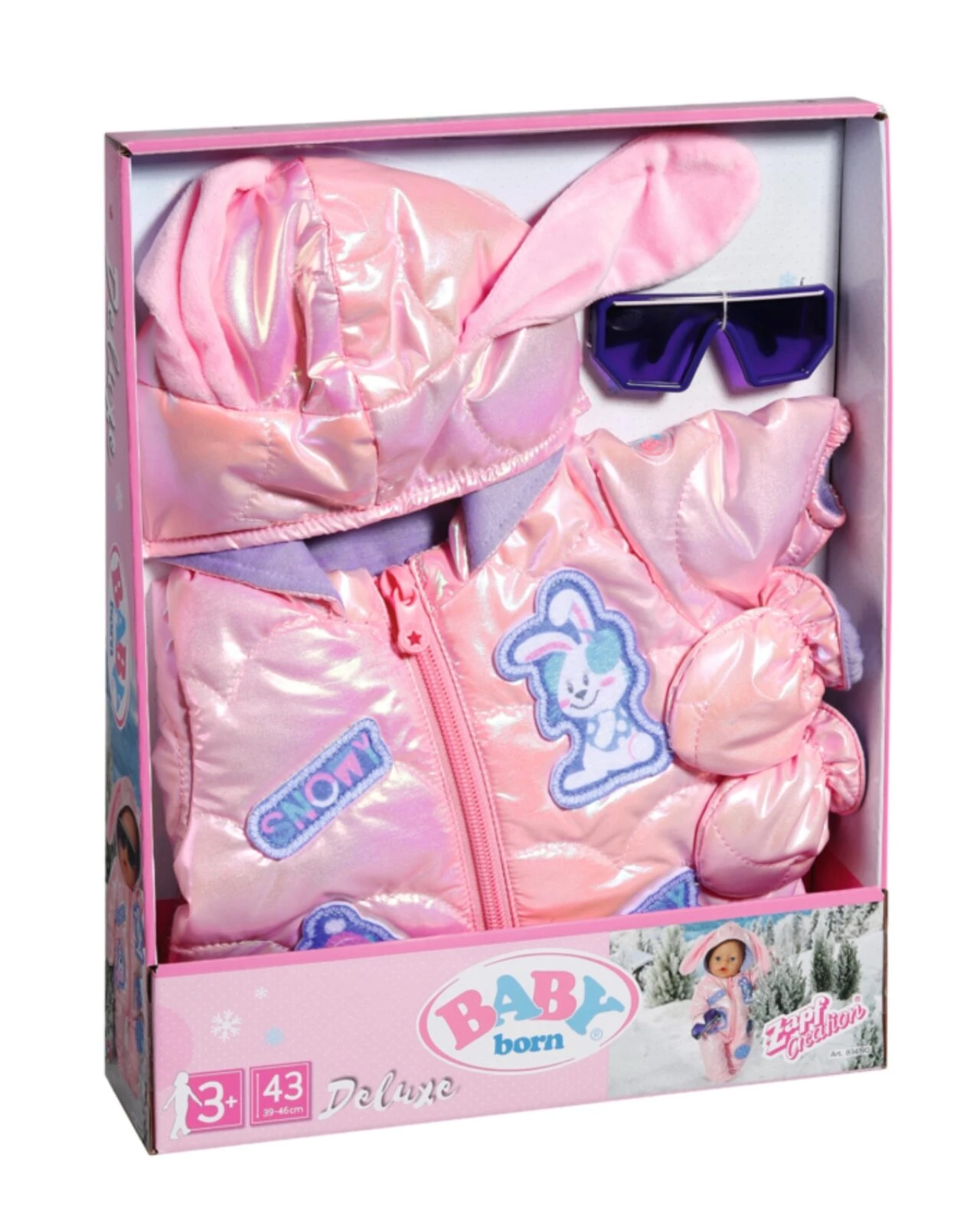 BABY born sieht mit den Schlappohren an der Kapuze aus wie ein Schneehase. Und zwar wie ein ganz besonderes Exemplar. Häschen in Metallic Pink, die in der Wintersonne Eisblau schimmern, sind so selten, wie Schneekristalle im Sommer. Der stylische Anzug ist mit coolen Aufnähern versehen. Das bequeme Teil ist so gut gepolstert, dass BABY born wie in weiße Zuckerwatte fällt, wenn sie auf einer Eisplatte ausrutscht. Dazu trägt das kleine Wintermädchen warme Handschuhe und eine blaue Sonnenbrille.