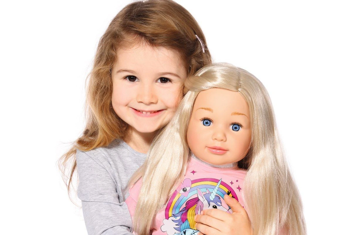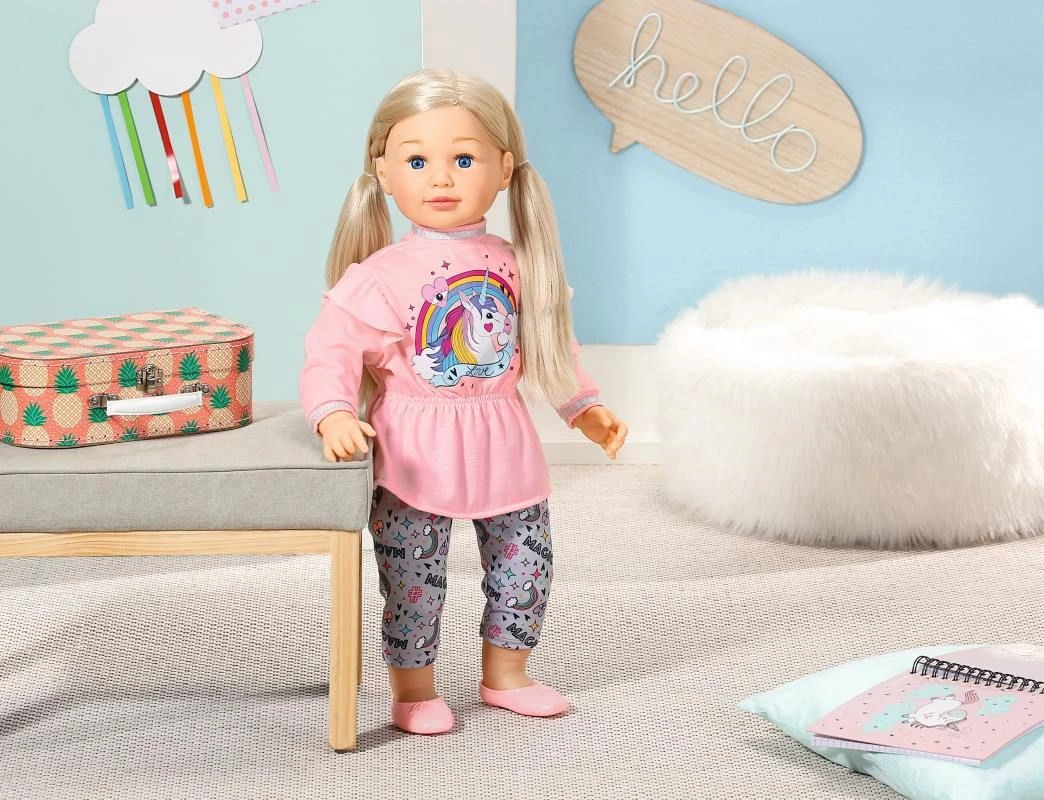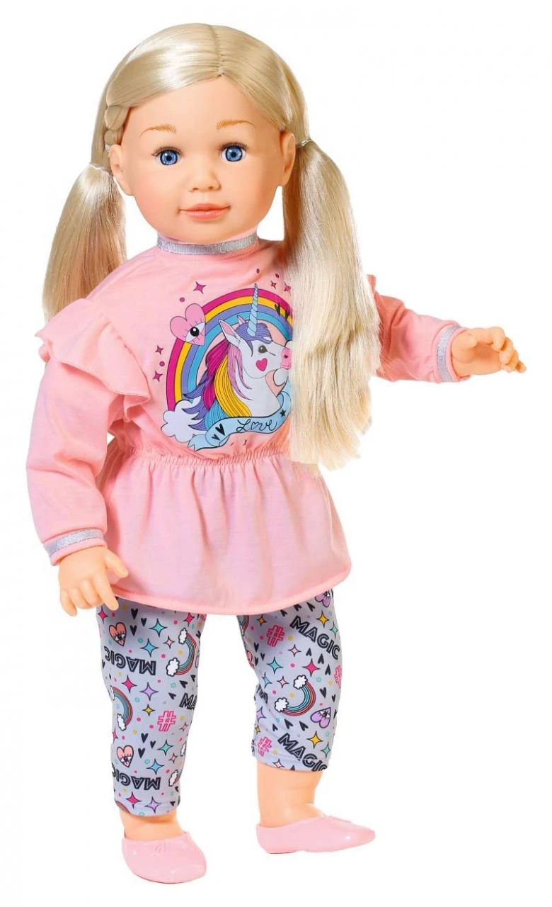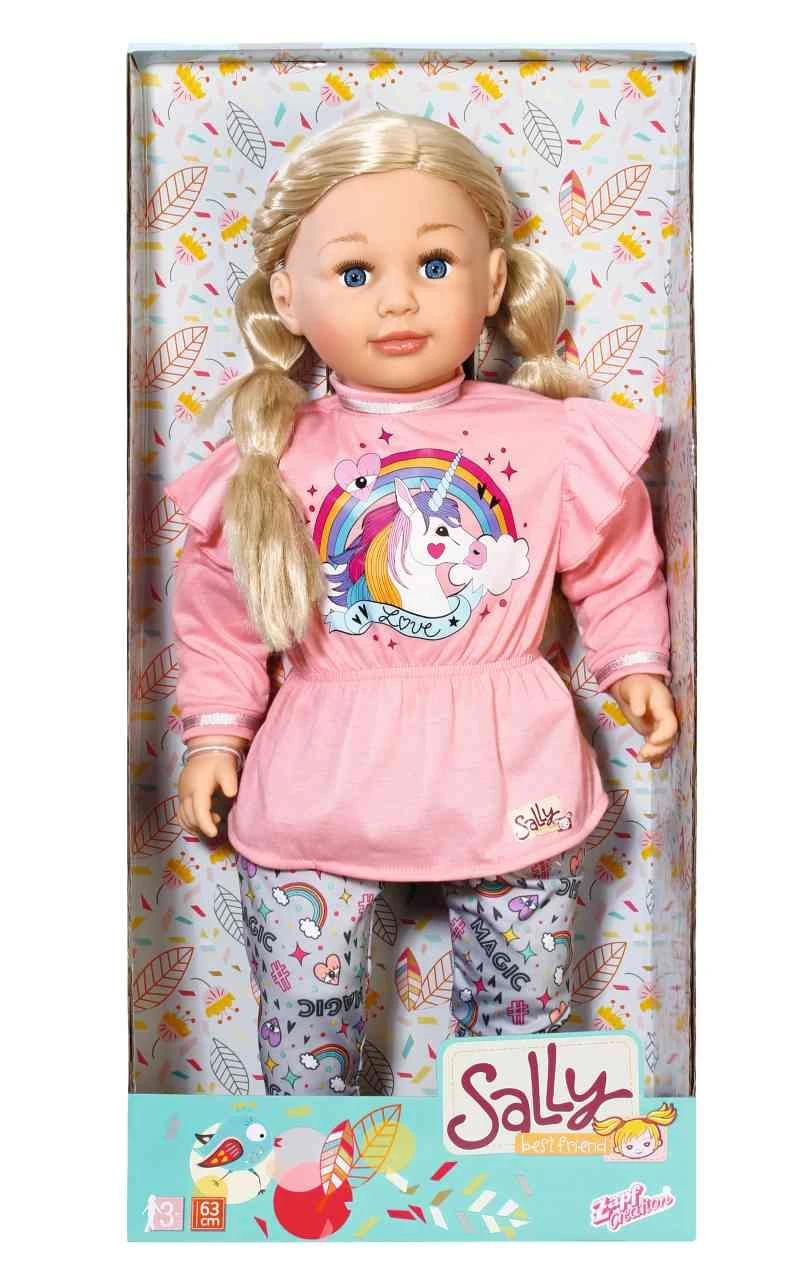 Sally ist die coole kleine Freundin mit der man Spielen, Kuscheln und Geheimnisse teilen kann. Die ca. 63 cm große Puppe mit dem weichen Stoffkörper mag lässige Outfits und kann auch mal richtige Kinderkleidung anprobieren. Am liebsten trägt sie das Longsleeve mit dem bunten Einhorn-auf-dem-Regenbogen-Druck.